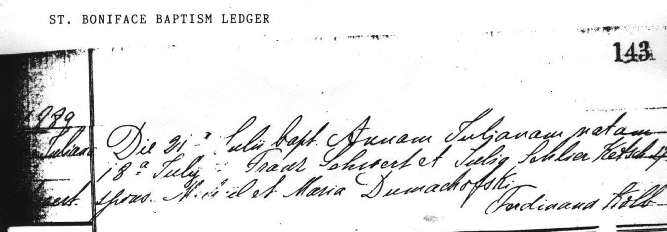 Anna was baptized on July 21, 1889, by Father Ferdinand Kolb of Saint Boniface R.C. Church, 124 Locust Street, Buffalo. Cemetery records indicate that she died of inanition on August 3, 1889, at the age of 16 days. The family at that time resided at 27 Ketchum Alley (changed in 1893 to Neptune Alley; now covered by Roswell Park Cancer Institute) in Buffalo. Anna is interred in an unmarked grave in Lot 5, Section UU, Line 6, Grave 5, United German & French Cemetery (Pine Hill), Cheektowaga, NY. |