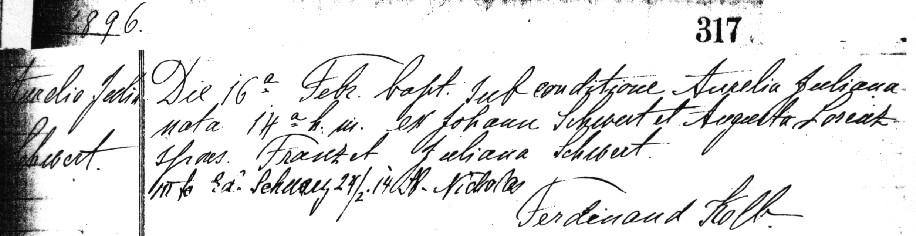 Aurelia (= "Lillian") Julia Schwert was born on February 14, 1896, and she was baptized by Father Ferdinand Kolb of Saint Boniface R.C. Church in Buffalo on February 16, 1896. Her godparents were Franz and Julianna Catharina (née Schlia/Schlee) Schwertfeger/Schwert.