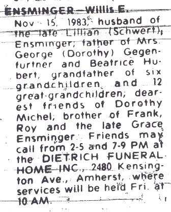 The obituary for Lillian’s father Johann (= "John") (1938) shows that she was at that time she was now married to Willis Edgar Ensminger. Willis, born on October 16, 1899, was a son of William and Annie Ensminger. Various Buffalo city directories show that Willis was a welder and that the couple resided at 10 Medford Place.