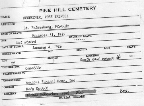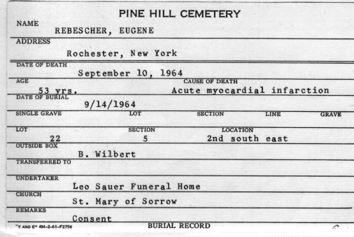Rebescher family plot, Lot 22, Sec. 5, United German & French Cemetery (Pine Hill), Cheektowaga, NY. A map to the gravesite is available here.