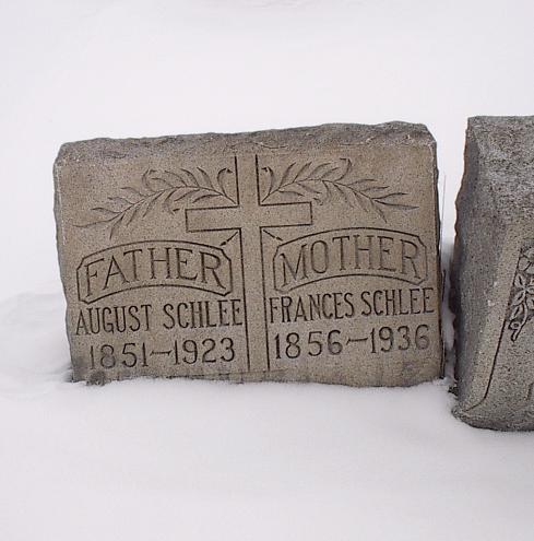On May 12, 1878 at Kladau, West Prussia, Francisca married August J. Schlia. August was born in Lagschau on August 20, 1851. He was the son of Jacob and Anna (née Potrotz) Schlyia (note many variants for surname spellings of these families). The Catholic church ledgers of Kladau show that August was baptized as "August Michael Schlyia" on August 31, 1851. According to John Penberthy (son of Rita [née Schleer] Penberthy and great grandson of August and Francisca), August later in the Prussian army. He lost part of his hand or fingers in battle. On November 5, 1880 in Lagschau, Francisca gave birth to a daughter, Anna Susanna Schlia. With their infant daughter, Francisca and August emigrated to the United States. They departed Hamburg, Germany on March 25, 1881 aboard the S.S. Hamburg. The Hamburg departure records list them as: Traveling with them were Francisca's brother Franz (= "Frank") Carl Schwertfeger, his wife Julianne (= "Julia") (née Schlia) Schwertfeger (a sister to August) and their infant son Johann (= "John"). At Liverpool, England, both familes transferred to the S.S. Canada, arriving in New York City on April 13, 1881. A mis-transcribed passenger manifest lists the Schlias as follows: The same passenger manifest also mistakenly lists the Schwertfegers as "Schwerfegor." The two families settled in Buffalo, New York --- in a German neighborhood known as "The Fruitbelt" due to several of its streets being named after fruit trees. Francisca and August anglicized their names: Francisca became "Frances (née Schwert) Schlee." August became "August J. Schlee." Labels on a photograph imply that yet another sibling, "Mary" Schlia / Schlee, emigrated to the United States; however records of the marriage (June 25, 1890, St. Boniface R.C. Church, Buffalo) of Mary to Bernhart (= "Bernhard") Potratz demonstrate that the maiden name of Mary's mother was "Koschmieder," while the maiden name of the mother for August and Julianna was "Potrotzka." Thus Mary was likely not a direct sibling of August and Julianna. (See further information, below). According to the Buffalo City Directory, August and Francisca resided in 1890 at 248 High Street (white building) -- apparently next door to Johann (John) and Maria (Mary) (née Schwertfeger) Patzke/Patz), who resided at 250 High Street. During their later years, August and Francisca resided at 255 Locust Street (now a vacant lot) in Buffalo, New York. They raised six children. Despite the implications of the 1900 Census, where it states that four of the four existing children still survived, there is an 1895 baptismal record for Jacob Michaëlew Schlia -- apparently a child who did not survive until the 1900 census. August died of pneumonia on June 5, 1923, at the age of 71 (the cemetery records state that he died on June 6th). Francisca died of pneumonia on May 17, 1936, at the age of 79. At the time of her death, she resided at 375 Florida Street in Buffalo (the street address on her interment record is in error). Both Francisca and August are interred in Lot 112, Sec. 8C, United German & French Cemetery (Pine Hill) in Cheektowaga, NY.
