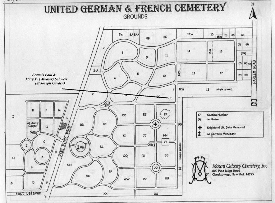 General location of the gravesites of Francis Paul Schwert and Mary Frances (née Measer) Schwert, Lot 114, Section 20, United German & French Cemetery (Pine Hill), Cheektowaga, NY. A map to locate the gravesite is available here.
