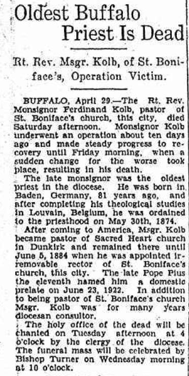 Rev. Msgr. Ferdinand J. Kolb Saint Boniface R.C. Church Buffalo, New York (1884 - 1929) Born: 17 October, 1847, Erfeld, Baden-Württemberg, Germany