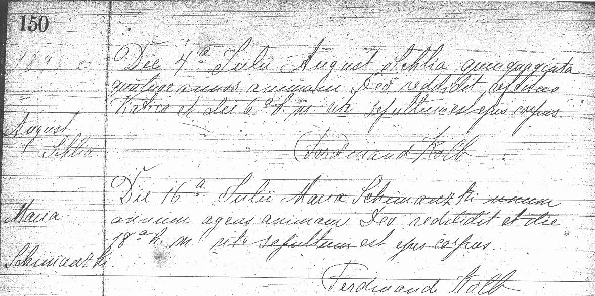 - August Schlia: Church record of the death of August Schlia, died July 4, 1898, age 54 years (indicating an approximate birth year of 1844); interred July 6, 1898. Record is from the death ledger of Saint Boniface R.C. Church, 124 Locust Street, Buffalo, New York. No parentage is indicated. "Schlia" is among the spelling variants of the original surname for the "Schlee" family of this lineage.