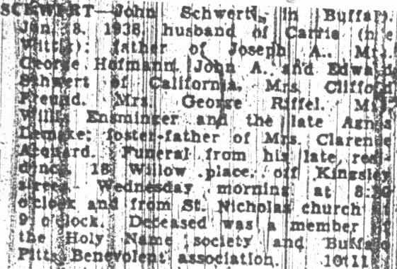 In early 1882, we know that Johann was residing with his parents in the tiny manorial village of Lagschau, Kr. Danziger Höhe, West Prussia. Johann departed to join his siblings Franz and Francisca (née Schwertfeger) Schlia in the industrial city of Buffalo, New York. Johann first traveled to Hamburg, Germany, where he then boarded the steamship India on April 5, 1882. After his arrival in Buffalo, Johann Americanized his name to "John Schwert." On April 10, 1883, Johann married Augusta (probably originally Auguste) Lorenz at Saint Boniface R.C. Church, 124 Locust Street, in Buffalo. Augusta was the daughter of August and Julianna (née Malinowska) Lorenz from the tiny settlement of Klopschau, located south of Katzke, West Prussia. According to the 1900 U.S. Census, Augusta was born in May, 1858. After their marriage, the couple resided at 18 Willow Place in Buffalo. Johann and Augusta had at least three sons and six daughters. The 1890 City Directory for Buffalo gives Johann's profession as being a "laborer." The 1928 City Directory lists his profession as being an "elevator operator." Records provided by Geri Ellerbrock present the following on Johann's U.S. citizenship status: Augusta died on June 2, 1912, at the age of 54 years, 24 days, of complications due to gallstones (cholecystitis). Johann married Carrie (née Wright) Wittig, born in 1869. He became foster-father to her daughter, Grace. According to the 1900 Census, Carrie had been the wife of John Wittig; the Wittig family had resided at 54 Mulberry Street in Buffalo. Johann died on January 8, 1938. He is interred with Augusta in Lot 428, Section VV, United German & French Cemetery (Pine Hill), Cheektowaga, NY. Carrie Schwert-Wittig died at the age of 94 on August 30, 1964, of myocardial infarction. Carrie is interred with her daughter Grace M. (née Wittig) Acquard and Grace's husband Clarence W. Acquard (1890-1964) in Lot 339, Section I, Mount Calvary Cemetery (Pine Hill), Cheektowaga, NY.